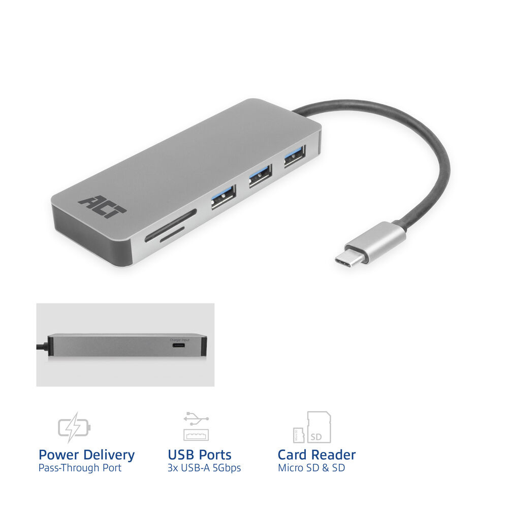 ACT USB-C hub 3.0, 3x USB-A, card reader, PD pass-through